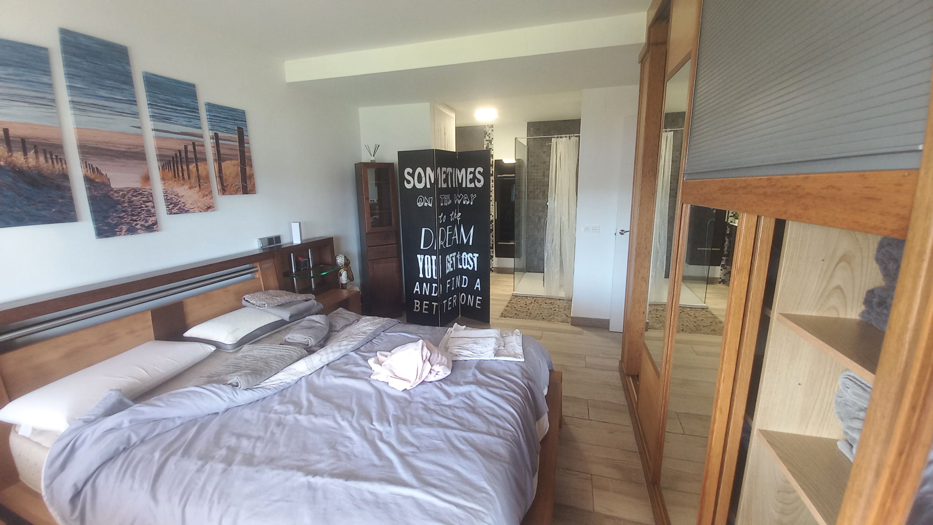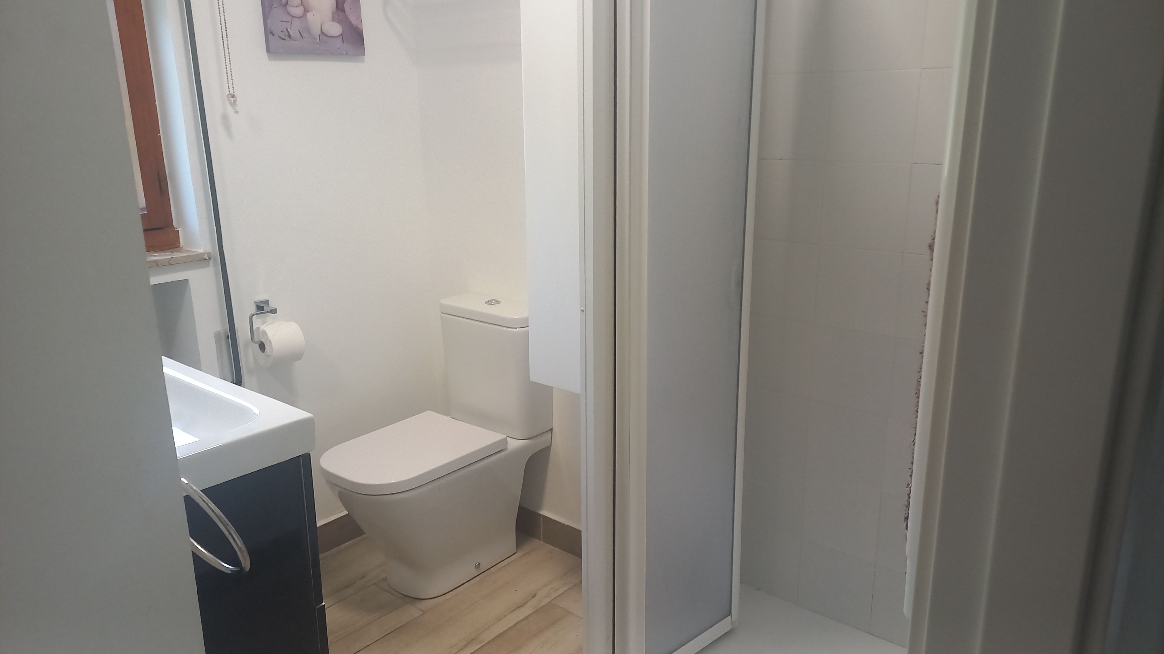 Hórreo habilitado como vivienda, con baño con plato de ducha en su parte inferior.